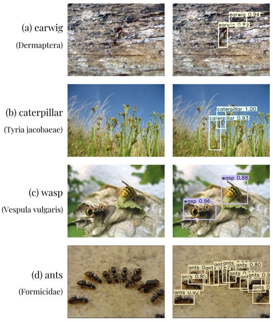 Detection effect of HCFormer model under multi-target situations: (a) earwig (Dermaptera); (b) caterpillar (Tyria jacobaeae); (c) wasp (Vespula vulgaris); (d) ants (Formicidae).