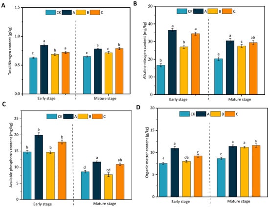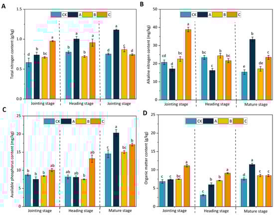 Effects of different fertilization treatments on soil nutrients during different reproductive periods of maize. Total nitrogen content (A), alkaline nitrogen content (B), available phosphorus content (C), and organic manure content (D). The CK (100% NPK at 750 kg ha−1), A (60% NPK at 450 + 20% BF at 150 kg ha−1), B (60% NPK at 450 + 40% BF at 300 kg ha−1) and C (60% NPK at 450 + 60% BF at 450 kg ha−1), respectively. The different lowercase letters indicate statistically significant (p < 0.05) variations across treatments.