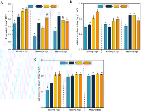 The impacts of various fertilization treatments on soil enzyme activities in wheat at different growth stages. Urease activity (A), alkaline phosphate activity (B), and sucrose enzyme activity (C) at the jointing, heading and mature stages, under treatments, CK (100% NPK at 750 kg ha−1), A (60% NPK at 450 + 20% BF at 150 kg ha−1), B (60% NPK at 450 + 40% BF at 300 kg ha−1), and C (60% NPK at 450 + 60% BF at 450 kg ha−1), respectively. The different lowercase letters indicate statistically significant (p < 0.05) variations across treatments.