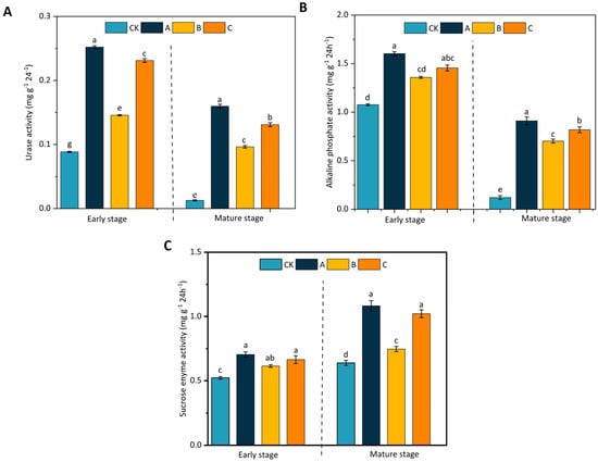 Effects of different fertilization treatments on soil enzyme activities at different maize growth stages. Urease activity (A), alkaline phosphate activity (B), and sucrose enzyme activity (C) at early and mature stages under different treatments, CK (100% NPK at 750 kg ha−1), A (60% NPK at 450 + 20% BF at 150 kg ha−1), B (60% NPK at 450 + 40% BF at 300 kg ha−1), and C (60% NPK at 450 + 60% BF at 450 kg ha−1), respectively. The different lowercase letters indicate statistically significant (p < 0.05) variations across treatments.