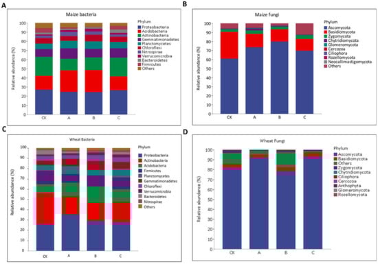 Effects of fertilization on bacterial (A,C) and fungal (B,D) taxonomic composition at phylum level under different treatments during winter wheat–summer maize cropping seasons. CK (100% NPK at 750 kg ha−1), A (60% NPK at 450 + 20% BF at 150 kg ha−1), B (60% NPK at 450 + 40% BF at 300 kg ha−1), and C (60% NPK at 450 + 60% BF at 450 kg ha−1), respectively. The numbers of distinct shades in columns show abundance at the phylum level.