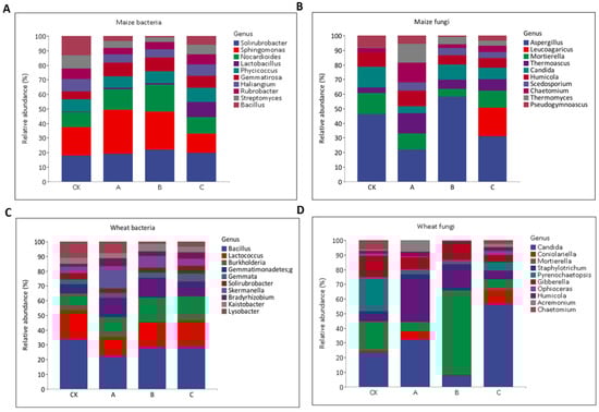 Changes in the relative abundance of soil bacteria (A,C) and fungi (B,D) in the maize-wheat cropping season under different treatments. The CK (100% NPK at 750 kg ha−1), A (60% NPK at 450 + 20% BF at 150 kg ha−1), B (60% NPK at 450 + 40% BF at 300 kg ha−1) and C (60% NPK at 450 + 60% BF at 450 kg ha−1), respectively. The numbers of various colors of the columns indicate the abundance at the genus level.