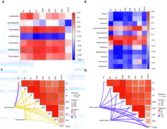 The correlation coefficients demonstrated associations between the composition of the microbial community and the activities of soil enzymes at the phylum and genus levels (Figure 5 and Figure 6). To investigate the correlation between fungal and bacterial differences during wheat–maize cropping seasons, total nitrogen (TN), alkaline nitrogen (AN), available phosphorus content (AP), soil organic matter (SOM), urease activity (URE), alkaline phosphatase (ALP) activity, sucrose enzyme activity (SEA) and yield were analyzed under different treatments during the different stages of wheat and maize (Figure 7). Lactobacillus, Solirubrobacter, Gemmatirosa, Streptomyces, Thermoascus, Scedosporium, and Thermomyces were targeted: only Solirubrobacter and Streptomyces showed positive correlations with TN, AN, AP, SOM, URE, ALP, SEA, and yield during the maize cropping season (Figure 7A). However, Bascillus, Lactococcus, Gemmata, Gemmatimonadetes, Solirubrobacter, Skermanella, Bradyhizobium, Mortierella, Staphylotrichum, Humicola, Acremonium, and Chaetomium showed a significant correlation between soil organic matter (SOM) and URE activity during the wheat cropping season. In contrast, the URE activity and SEA showed significant correlations during the maize cropping season (Figure 7A). Bacillus and Lactococcus showed mostly positive correlations across the variables, particularly with yield, indicating that their presence might be beneficial for crop productivity. Gemmata and Gemmatimonadetes exhibit a mix of weak positive and negative correlations without significant impact on most variables. Bradyrhizobium has strong, significantly negative correlations with some variables, notably SEA and ALP, suggesting an inhibitory or competitive effect in these contexts. Chaetomium showed strong negative correlations across several variables, particularly with yield, indicating potentially harmful effects on soil properties or crop performance (Figure 7B). Moreover, AN and AP showed significant correlations during the maize cropping season, and URE showed a significant correlation during the wheat cropping season (Figure 7C,D).
