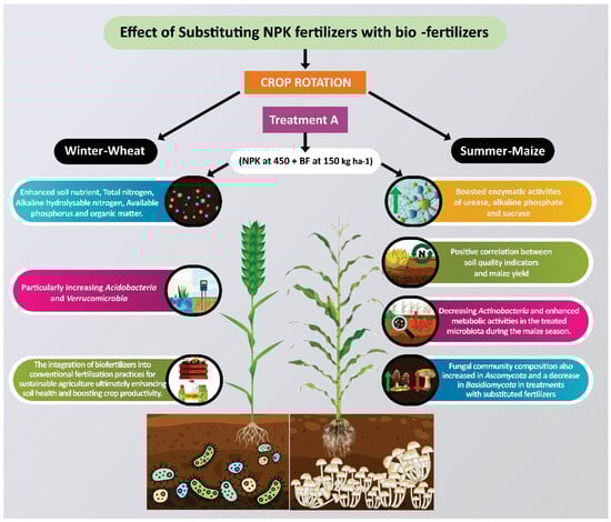 In summary, the study demonstrated that the partial replacement of NPK compound fertilizers with biofertilizers significantly improved soil nutrient contents and enzymatic activities. It improved soil health and nutrient availability in the winter wheat and summer maize (Figure 8). The use of bacterial fertilizer in treatment A showed the most promising results in increased maize yield. Further, the application of biofertilizers positively influenced the diversity and richness of soil microbial species, it notably increased Acidobacteria and Verrucomicrobia populations while decreasing Actinobacteria. This treatment also enhanced metabolic activities in the microbiota during the maize season including amino acid, carbohydrate, energy, lipid, and vitamin metabolisms during the maize season. The fungal community composition also changed, with an increase in Ascomycota and a decrease in Basidiomycota in treatments with substituted fertilizers. These findings highlight the advantages of incorporating biofertilizers into traditional fertilization practices for sustainable agriculture. This approach not only improves soil health but significantly boosts crop productivity.
