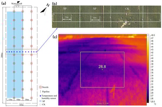 The experimental field (a), aerial view of the layout of temperature and humidity sets (b) and the thermal infrared image (c). In subfigure (a), field with the light blue background represents theoretical spraying area (SP), and the white area represents not sprinkler irrigated and taken as control (CK). In the thermal infrared image (subfigure (c)), the value (28.8) is the mean canopy temperature in the white box.