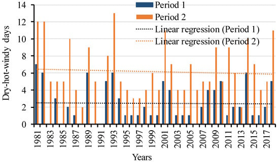 Days with a dry–hot–windy climate from 20 to 31 May (Period 1) and from 20 May to 10 June (Period 2) in the winter season from 1981 to 2018. During Period 1, wheat was in the middle and late grain-filling stages and was highly sensitive to the DHW climate. During Period 2, the DHW climate occurred frequently.