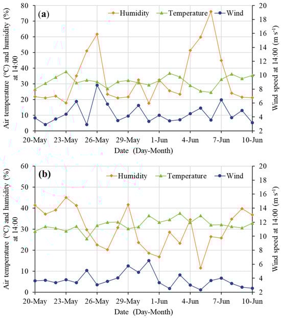 Air temperature, humidity and wind speed at 14:00 from 20 May to 10 June in the 2019 (a) and 2022 (b) seasons.