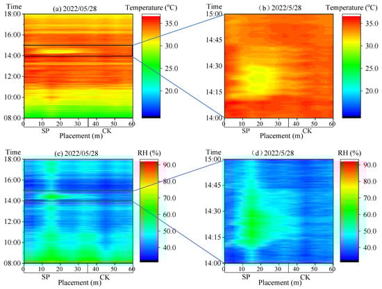 Spatial and temporal distributions of air temperature at approximately 10 cm above the wheat canopy in the experimental field from 8:00 to 18:00 on 28 May 2022. The water was sprayed from 14:00 to 14:25. Subfigures (a,c) represent the air temperature and humidity changes during the whole day, respectively, and (b,d) indicate the significant changes in air temperature and humidity during and after spraying, respectively. The data in the horizontal direction indicate the distance from the west edge of the experimental field. SP and CK indicate the spraying influencing area and no water area, respectively. The sprinkler pipe was deployed at a distance of approximately 15 m from the west edge.