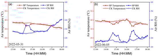 Similar to the change in air temperature, the relative humidity increased by 6–11% during the spraying period, decreased quickly after the spray stopped and was finally close to that under no-spraying condition 30–60 min later. When there were two spraying events, both spray events had similar effects on the relative humidity changes (Figure 5b). Generally, after one or two spraying events, the relative humidity will ultimately increase, and the effects of low humidity under a DHW climate will be alleviated.