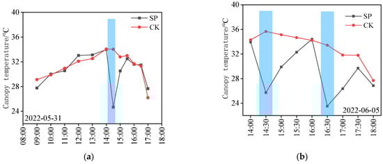 Measured canopy temperatures of winter wheat in the field with (SP) and without (CK) water spraying on 31 May with one spraying event (a) and on 5 June with two spraying events (b) in the 2022 season. The light blue bar in the figure represents the water spraying period.