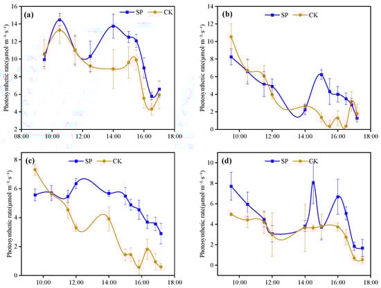 Daily curves of the photosynthesis rates of flag leaves of winter wheat with (SP) and without (CK) spraying water on four dry–hot–windy days: 28 May (a), 31 May (b), 3 June (c) and 5 June (d) in the 2022 season.