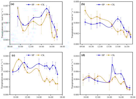 Daily curves of transpiration rates of flag leaves of winter wheat with (SP) and without (CK) spraying water on the four featured dry–hot–windy days: 28 May (a), 31 May (b), 3 June (c) and 5 June (d) in the 2022 season.