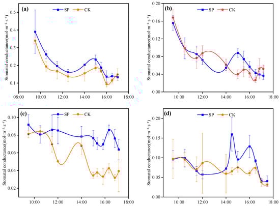 Daily curves of stomatal conductance of flag leaves of winter wheat with (SP) and without (CK) spraying water on four dry–hot–windy days: 28 May (a), 31 May (b), 3 June (c) and 5 June (d) in the 2022 season.