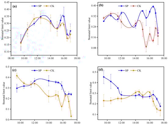 Daily curves of stomatal limitation values for photosynthesis of flag leaves of winter wheat with (SP) and without (CK) spraying water on the four featured dry–hot–windy days: 28 May (a), 31 May (b), 3 June (c) and 5 June (d) in the 2022 season.