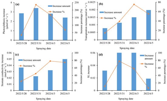 The mean increases in the Pn, Tr and Gs one hour after one spraying (28 May and 31 May) and three hours after two sprayings (3 June and 5 June) are shown in Figure 11. The mean Tr and Gs increased from the first spraying on 28 May to the last spraying on 5 June, and the corresponding increase percentages ranged from 15 to 55% in the Tr and from 24 to 79% in the Gs (Figure 11a,c). The Pn increased from the first to the second spraying and then slightly decreased (Figure 11c). The percentages of increase in the Pn from the first to the last spraying days were 34%, 235%, 167% and 62%, respectively, and the mean percentage increase was 126%. Compared with the increase in Tr (mean value of 46%), the increase in Pn (mean value of 126%) was much greater, indicating a greater water use efficiency. Figure 11d shows that the stomatal limitation value (Ls) for photosynthesis in the spraying field increased by 11.3% on the first day (28 May) to 78% and 58% on the second and third days (31 May and 3 June), respectively, and finally to 7% on the last day (5 June). The mean percentage increase in Ls in the spraying field was 39% greater than that in the CK.
