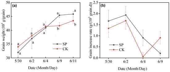 Grain-filling process of winter wheat in fields with (SP) and without (CK) spraying practices from 30 May to 11 June at harvest in 2022. Subfig. (a) represents the change process of grain mass amount with time, and (b) represents the increasing rate of grain mass with time. The different lower letters below and above the corresponding points on subfig. (a) mean their difference is significant and the same letters mean insignificant at 0.05 level.