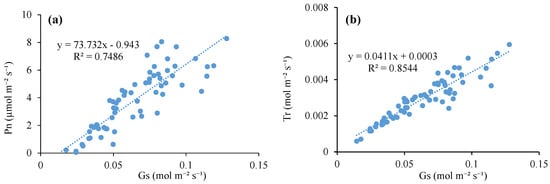 Relationships between photosynthetic rate Pn (a), transpiration rate Tr (b) and stomatal conductivity (Gs). The data shown in the figure are from measurements taken on 2 June 2022.