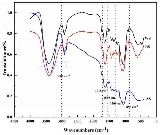As a whole, the order of absorption peak intensity was WS > RS > AS at the same wavenumber. FTIR characteristics of AS, RS, and WS were shown in Figure 2, which indicated a similar trend in the main absorption peaks of 858 cm−1, 1300 cm−1, 1539 cm−1, 1715 cm−1, and 3009 cm−1. The absorption peak at 858 cm−1 pointed to the stretching vibration of -CHO in AS lower than that in WS and AS. The bending vibration O-H at 1300 cm−1 showed the compounds of phenols, alcohols or carboxylic acids. The bending vibration N-H at 1539 cm−1 illustrated the amine-group compound. The stretching vibration C=O at 1715 cm−1 forecasted the compounds of ketones, aldehydes or carboxylic acids. The stretching vibration C-H at 1715 cm−1 forecasted the alkene compound. The aromatic ketones and aromatic carboxylic acid compounds (benzophenone, benzoic) were considered the main substances in the three materials, which may provide nutrients for soil microorganisms during the decomposition of a long-term leaching experiment. Then, the activities and abundances of relative microorganisms can mediate the CH4 emissions rates.
