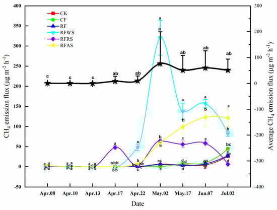 Dynamic changes of CH4 flux in various treatments, and average CH4 emission flux over the course of an 85-day leaching experiment among all treatments (i.e., CK: control treatment without organic material and fertilizer; CF: conventional fertilization; RF:20% fertilizer reduction compared with CF; RFWS: RF plus wheat straw amendment; RFRS: RF plus rapeseed shell amendment; RFAS: RF plus astragalus smicus amendment). Data (means ± SD, n = 3) followed by different letters indicate significant differences among treatments at p < 0.05.