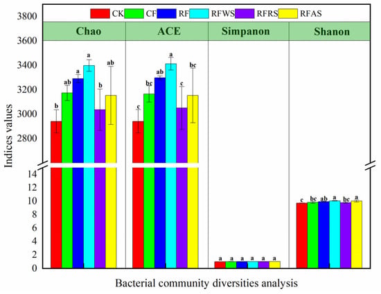 Analysis of bacterial community diversity in various treatments (i.e., CK: control treatment without organic material and fertilizer; CF: conventional fertilization; RF: 20% fertilizer reduction compared with CF; RFWS: RF plus wheat straw amendment; RFRS: RF plus rapeseed shell amendment; RFAS: RF plus astragalus smicus amendment). Data (means ± SD, n = 3) followed by different letters indicate significant differences among treatments at p < 0.05.