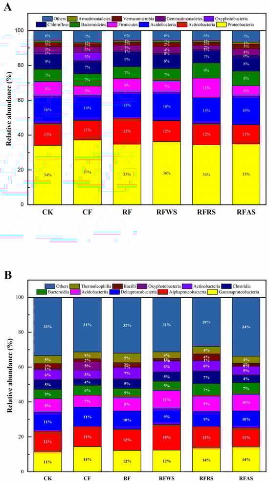 The top ten dominant bacterial communities were identified in Figure 5A,B at the phylum and class levels, respectively. In this study, Proteobacteria, Actinobacteria, and Acidobacteria were regarded as the three major bacterial communities at the phylum level, with average proportions of 35.2%, 12.3%, and 15.3%, respectively. Among them, the relative distribution of Proteobacteria was significantly higher than that in all treatments, but no difference existed among the different treatments. For Firmicutes, the proportion of RFRS (11%) was higher than that in the CK (8%), RF (8%), RFWS (7%), RFAS (6%), and CF (5%) treatments. In addition, Gammaproteobacteria, Alphaproteobacteria, Deltaproteobacteria, and Acidoproteobacteria were considered to be the main bacterial communities at the class level, with average contributions of 12.8%, 12.2%, 10.0%, and 8.8%, respectively. Compared to CK (11%), the distribution of Gammaproteobacteria in the CF, RF, RFWS, RFRS, and RFAS amendments increased to 14%, 12%, 12%, 12%, and 14%, respectively. The contribution of Alphaproteobacteria was the highest in the RFWS treatments among all bacterial relative abundances, accounting for 15%. The abundance of Deltaproteobacteria ranged from 9% to 11%, which was higher than the distribution of Acidoproteobacteria in all treatments, ranging from 7% to 11%.