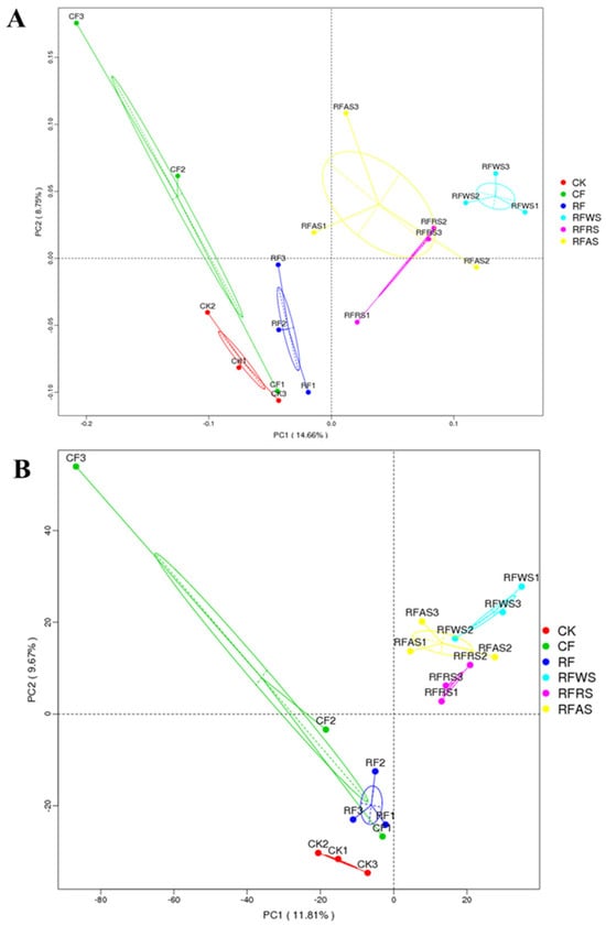 To understand the effect of fertilizer reduction combined with organic materials on the structural composition of soil microorganisms, the differences in soil bacterial community structures were analyzed by PCoA (Figure 6A) and PCA (Figure 6B). The loadings for all variables involved in the PCA in different treatments are shown in the Supplementary Materials. PC1 and PC2 were obtained, with contributions of 14.7% on the first axis and 8.75% on the second axis in PCoA, which indicated a similar OTU composition between the RFWS and RFAS treatments. However, the CF and RFRS treatments showed similar variations in OUT compositions in PCoA, with the dispersion of data points in the four quadrants.