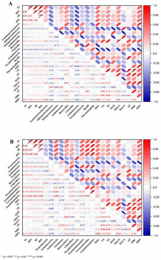 To explore the relationship between bacterial communities and environmental factors (Table S4), the changes of the top ten dominant soil bacterial communities and soil relative indices are shown by heatmap analysis at the phylum and class levels (Figure 7A,B). The correlation of soil bacterial communities and soil indices was analyzed using Origin Pro (Origin 2021, USA) and a p-value at 0.05, 0.01 and 0.001 levels, respectively. Overall, the indices of FI (Fluorescence intensity), HIX (Humification index) and α:β (ratio of new and old carbon), which represented soil dissolved organic carbon (DOC) spectral characteristics, had a highly significant correlation (p < 0.001). At the phylum level, Verrucomicrobia had a significant association with Armatimonadetes (p < 0.01), and the contribution of the Bacteroidetes community was significantly correlated with soil NH4+ (p < 0.01), suggesting the crucial effect of soil characteristics on soil microbial structures. Regarding the class level, the relative abundance of Bacteroidia was strongly correlated with soil NH4+ (p < 0.01). Additionally, the relative distribution of Actinobacteria showed a significant relationship with soil DOC and microbial biomass nitrogen (MBN) (p < 0.05), and the Bacilli community was significantly related to soil AP concentration.