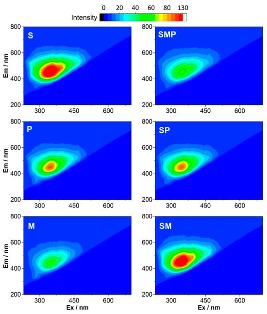EEM spectra of dissolved organic matter in water for different treatments: S, addition of peat soil, P, addition of plant litter, M, addition of yak manure, SM, combined addition of peat soil and yak manure, SP, combined addition of peat soil and plant litter, SMP, combined addition of peat soil, plant litter, and yak manure.