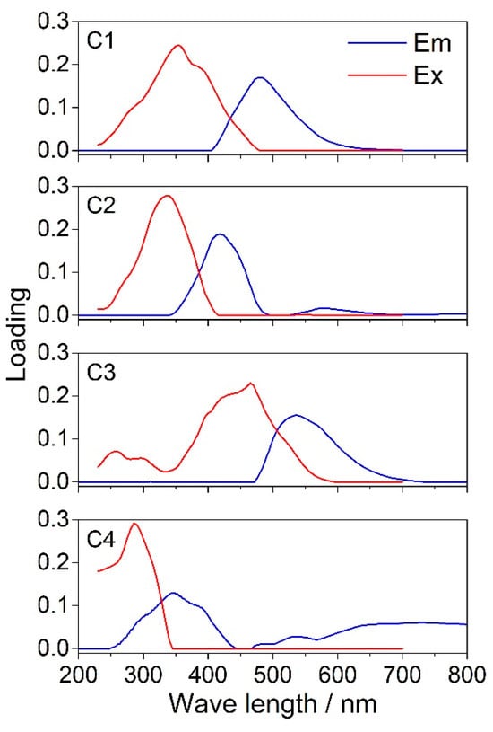 Spectra loading of fluorescence components (C1–C4) of dissolved organic matter in water by the EEM spectroscopy and parallel factor analysis.