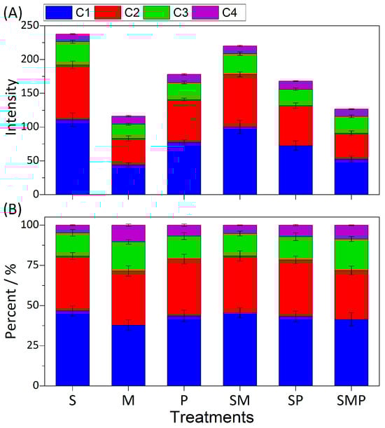 Four fluorescence components (C1–C4) for the DOM were identified in all the samples by the EEM-FARAFAC, which may be assigned to be as follows: UVA fulvic-like substances with maximum Ex/Em loading at 380/485 nm (C1), UVC fulvic-like substances with maximum Ex/Em loading at 340/430 nm (C2), humic-like substances with maximum Ex/Em loading at 460/540 nm (C3), and tryptophan-like substances with maximum Ex/Em loading at 285/350 nm (C4) (Figure 1 and Figure 2) [2,31,32,33]. Among them, C1 (37.55–46.81% of total fluorescent components) and C2 (29.91–35.53% of total fluorescent components) were the dominant EEM components in the DOM of all the water samples, whilst C4 had the lowest abundance, accounting for 4.42–10.88% (Figure 3). Among the treatments, the S and M samples had the highest and lowest fluorescence intensities, respectively (Figure 3). The M and SMP samples had the highest proportion of C3 (18.08% for the M and 19.61% for the SMP) and the lowest proportions of C1 (37.55–41.64% of total fluorescent components) and C2 (29.91–33.79% of total fluorescent components). Meanwhile, the M samples possessed the highest proportion of C4 (10.35 ± 0.70% of total fluorescent components) (Figure 3).