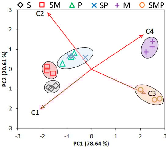 Principle component analysis plot for the fluorescence components (C1–C4) of dissolved organic matter in water for different treatments: S, addition of peat soil (diamond), P, addition of plant litter (triangle), M, addition of yak manure (plus), SM, combined addition of peat soil and yak manure (square), SP, combined addition of peat soil and plant litter (multiple), SMP, combined addition of peat soil, plant litter, and yak manure (circle).