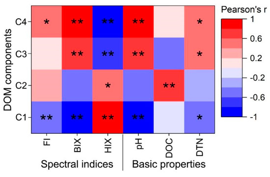 Heatmap showed a correlation of fluorescence components (C1-C4) with basic properties and spectral indices of the DOM in collected samples. HIX, humification index, FI, fluorescence index, BIX, biological index. DOC, dissolved organic carbon, DTN, dissolved total nitrogen. * and ** represented significant correlations at p < 0.05 and 0.01.