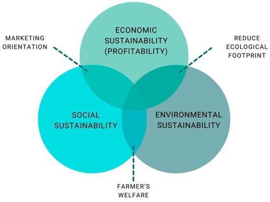 The varietal innovation (VI) adoption among Colombian farmers is analyzed by examining the arracacha (Arracacia xanthorrhiza Bancroft) production sector. Our hypothesis revolves around the premise that farmers adopt VI in response to their changing technical demands, closely related to facilitating adaptation to climatic and market vicissitudes. Additionally, public policies and the organization of the supply chain play fundamental roles in shaping farmers’ decision-making paradigms. This study adopts a sustainability-focused approach, summarizing the triple bottom line of social, economic, and environmental facets (Figure 1).