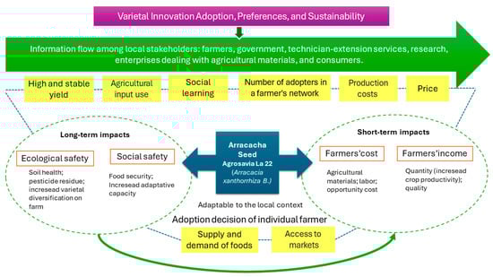 We delineate a conceptual framework for this study, as shown in Figure 2, which comprehensively considers the complexities surrounding the adoption of modern varieties, specifically arracacha and their potential long- and short-term impacts for farmers and agriculture. This framework emphasizes the fundamental interactions between farmers’ well-being and the prominent dimensions underpinning the adoption of varietal innovation, encompassing economic, social, and environmental domains. Through clear interconnections, Figure 2 shows how the assimilation of these modern varieties can directly shape farmers’ quality of life while simultaneously evaluating their contributions to economic sustainability, social advancement, and environmental conservation. Decision-making regarding adopting agricultural technologies is often guided by anticipated welfare motives, primarily involving increased net household income, enhanced net labor remuneration, and/or reduced risk exposure []. The importance of these factors may differ among marginal, small, and medium-scale farmers: the former exhibit greater sensitivity to risk mitigation, while the latter gravitate towards achieving higher net incomes.
