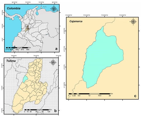 The study was conducted in Cajamarca (Tolima, Colombia) (Figure 3), renowned for its mountainous terrain and high-altitude landscapes, where slopes exceed 50%. The prevailing environmental conditions include an annual precipitation of 1000 a 2500 mm, an average annual temperature of 12 to 18 °C, and a relative humidity of 82 to 87.5%. Cajamarca, a municipality with a population of 19,408 (47.5% rural area and 52.5% urban area), consists of two main populated centers: the town center of Cajamarca and the locality of Anaime. The area is renowned for its agricultural suitability, earning it the moniker of Colombia’s ‘agricultural larder’. Planting arracacha in Cajamarca is a longstanding tradition representing this region’s most significant crop production [].