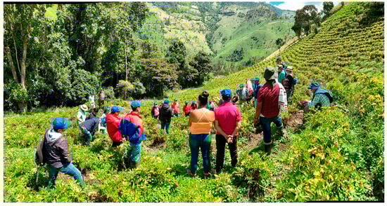 Our study primarily focuses on small arracacha producers in Cajamarca (Tolima, Colombia), for whom arracacha significantly contributes to food security (Figure 3). Arracacha, also known as Peruvian carrot, is a root vegetable from the Apiaceae family, alongside celery and carrot, originating from the Andean region of South America. The edible portion of the plant comprises six or more tuberous roots, which can be elongated, cylindrical, or conical, measuring about 4 cm thick and up to 20 cm long, covered with thin, lustrous skin. Commercial arracacha production is concentrated in South America, particularly Brazil, Colombia, Venezuela, and Ecuador, and, to a lesser extent, in Peru and Bolivia. The high market prices and the robustness of the crop, coupled with its reputation as a nutritious product, have spurred cultivation in Colombia, where average productivity stands at approximately 12 t ha−1. However, adopting new genetic material alongside improved agricultural techniques has already led to yields exceeding 20 t ha−1 [].