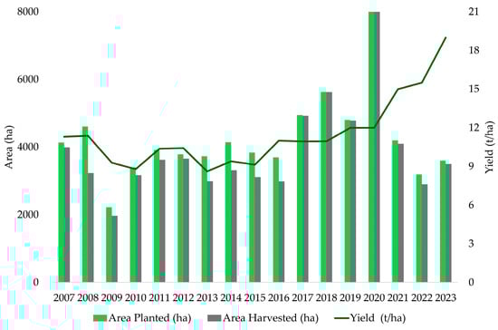 Evolution of arracacha cultivation and yield in Cajamarca (Tolima, Colombia) (2007–2023). Note: Own elaboration based on data from [].