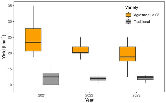 The comparative analysis of productivity (t ha−1) distributions, based on stakeholders’ reported yields, reveals differences between the Agrosavia La 22 arracacha variety and the traditional variety (Figure 6). Yield data provided by key stakeholders was used to create a boxplot comparison. Agrosavia La 22 consistently outperforms the traditional variety across all three years, as evidenced by higher median yields. In 2021, Agrosavia La 22 achieved a median yield of approximately 22 t ha−1, significantly surpassing the traditional variety, which reported a median yield of approximately 12 t ha−1. This trend persists in 2022, with Agrosavia La 22 recording a median yield of around 24 t ha−1 compared to the traditional variety’s median yield of approximately 13.75 t ha−1. However, there is a slight decline in the median yield of Agrosavia La 22 in 2023, dropping to approximately 20 t ha−1, while the traditional variety maintains a relatively stable yield of around 12.5 t ha−1.