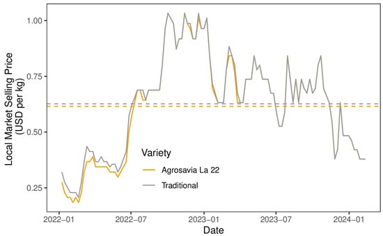 The additional unitary benefit per unit of yield obtained with the new variety considers both the change in yield and price changes (Equation (3)) []. The economic logic behind this equation is to evaluate the additional benefit per unit of yield, considering both the change in yield and price due to the improved quality of the new variety. In this context, the term ΔP reflects the price improvement attributable to the quality of the new variety compared to the traditional one. If the new variety has superior quality and therefore commands a higher price, this term will reflect the increase in income due to the new product quality.