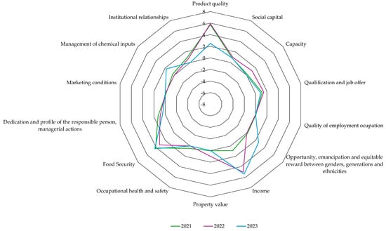 The performance index of social indicators for adopting the Agrosavia La 22 arracacha variety in Cajamarca, Tolima, as depicted in Figure 7, reveals a dynamic impact from 2021 to 2023. The average coefficient for the social impact index was 1.31 (on a scale of −15 to +15). Figure 7 illustrates annual performance indices of social indicators among farmers regarding the adoption of the improved arracacha variety, Agrosavia La 22, compared to the traditional local variety across various criteria from 2021 to 2023 (see Figure S1 for the social impact index for each year).