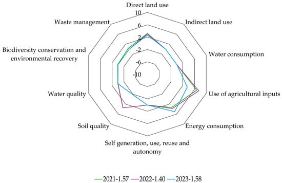 The method evaluates the increase, decrease, or absence of change in the considered indicators due to the technology’s adoption in production establishments (indicator change coefficient). Furthermore, it assesses the occurrence scale of the indicator, i.e., the spatial extent of changes in the indicators resulting from the analyzed technology []. Although it is a qualitative method, the magnitude and spatial extent of changes are quantified on a numerical scale, allowing for obtaining an average impact index of the technology and each of the 27 analyzed criteria. These indices are expressed on a scale from +15 to −15, representing the highest possible positive impact of technology to the highest possible negative impact, which results from multiplying the indicator change coefficients by their occurrence scale and corresponding weighting factor, yielding the impact coefficient of each indicator. The sum of these coefficients provides the impact coefficient associated with the technology’s use [].