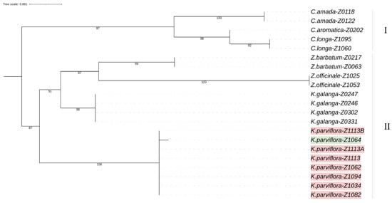 Two clades are recognized in the dendrogram, wherein Clade I is exclusively composed of Curcuma species and has very strong bootstrap support, with values exceeding 95%; Clade II is composed of Kaempferia and Zingiber species, with significant bootstrap support ranging from 87 to 100% at major nodes. Within K. parviflora, the accession Z1064, morphologically classified as the green type, is of particular interest. The branch length associated with Z1064 is substantially longer than those of other accessions, hinting at potential genetic divergence.