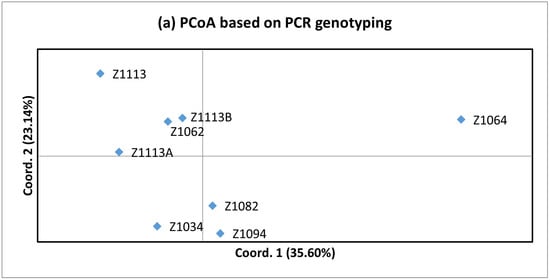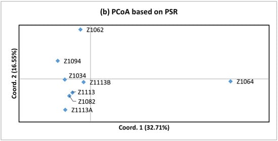 PCoA was performed based on both PCR genotyping and PSR. The first two coordinates can explain 58.74% of the variations in PCR genotyping and 49.26% variations in PSR. From both sources, accession Z1064, which is recognized as the green type, is separated from the red type accessions (Figure 2).