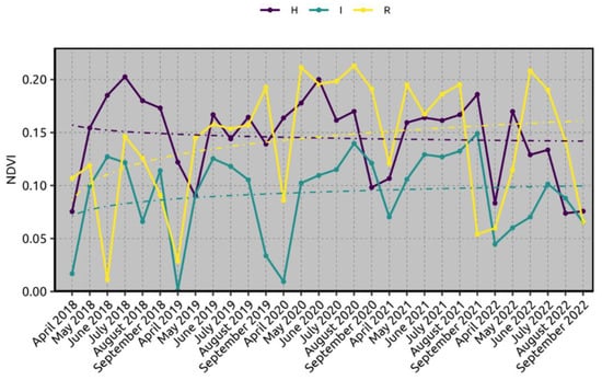 Normalized difference vegetation index (NDVI) trend assessed through satellite imagery from April 2018 to September 2022 for a resilient olive grove located in Parabita (Lecce province). The data have been compared with nearby visibly infected trees and with healthy ones located in Taranto province. H: healthy olive trees; I: infected olive trees; and R: resilient olive trees. For each condition of state health, an average logarithmic trendline was drawn to show the trend. Notice that the NDVI value of the resilient trees is higher than that of the healthy ones during the last two years. Reproduced from [13].