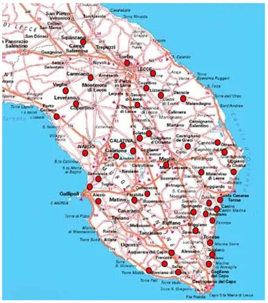 Mapof Lecce province that shows the occurrence of resilient olive groves. Red circles indicate the municipality where these olive groves were noticed.