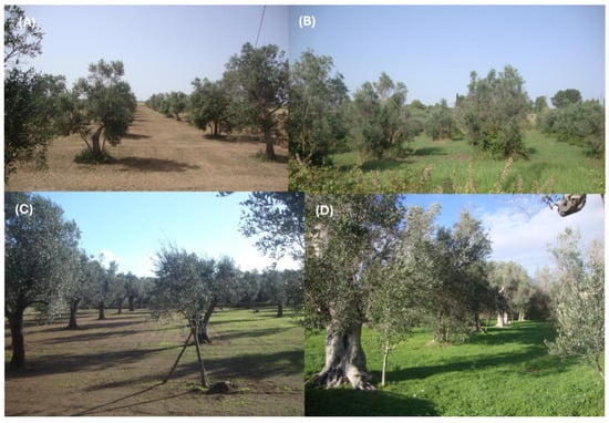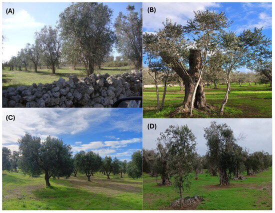 Resilient olive groves planted with Cellina di Nardò and Ogliarola salentina as observed in Lecce province in November 2023. (A) Nardò; (B) Maglie; (C) Diso; and (D) Spongano. In panels (A,D), it is evident that the new crown was obtained upon the cutting of the main tree branches that wilted upon Xylella fastidiosa subsp. pauca infection and the sucker resprouting.
