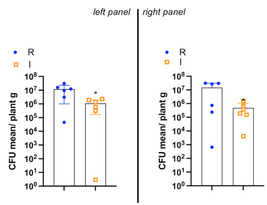 Boxplot representation of quantitative PCR quantification of Xylella fastidiosa subsp. pauca within the crown of infected (I) and resilient (R) olive trees. In the left panel are the reported results of six trees of cultivar Cellina di Nardò; in the right panel are the reported results of six trees of cultivar Ogliarola salentina. Data are expressed as CFU mean ± S.D. (* p < 0.02, R vs. I). I: indicates olive trees symptomatic and positive to X. fastidiosa subsp. pauca; R indicates positive to X. fastidiosa subsp. pauca and resprouting olive tree. Reproduced from [13]. Notice that the cell concentration of the bacterium is even higher in the resilient trees than in the infected ones.