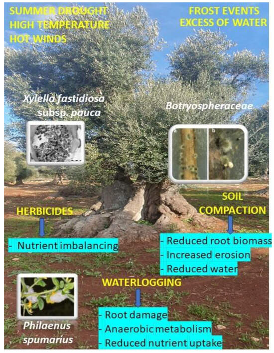 The herein-discussed abiotic factors that currently act on the resilient olive groves can be framed within the climate change scenario for which the resilience of plants should be enhanced [67]. Among the general negative effects that climate change (i.e., drought, hot temperatures, and excess of water) can impose on plants, there are physiological alterations (i.e., increased transpiration rate and reduced net photosynthesis rate), morphological alterations (i.e., shoot growth inhibition, leaf senescence and abscission, and inhibited growth root), metabolic alterations (i.e., alteration in nitrogen and carbohydrate metabolism and production of reactive oxygen species), and reproductive alterations (reduced crop growth rate and fruit set) [68]. Some potential proposed solutions to achieve resilience in crops could be a better understanding of agronomical techniques to conserve soil water, organic matter, and beneficial microorganisms, providing specific crop microbiota to promote tolerance to stress, improving phenotyping for the identification of genes responsible for resilient traits, and improving research to understand signaling in molecular pathways related to resilient traits [68].