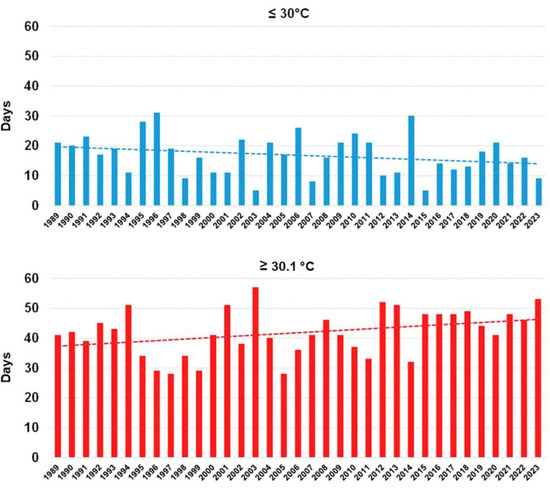 Number of days in which maximum temperatures reached values ≤ 30 °C and ≥30.1 °C in the period of July–August in Galatina (Lecce province) and in the time span of 1989–2023. Dashed lines are the trend lines. Reproduced from [31].