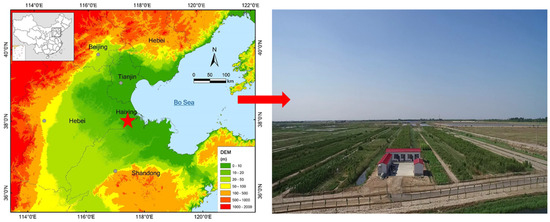 This study was carried out at the Haixing Experimental Station for the Efficient Utilization of Saline–Alkali Land Resources, Chinese Academy of Sciences, which is located in Haixing County, Hebei Province, North China. The coordinates of the station are 117°57′17′′–117°58′31′′ E, 38°16′83′′–38°17′59′′ N (Figure 1). The study site was located 24.8 km from the Bohai coastline, which is characterized as a prototypical coastal salt marsh. The WRB (World Reference Base for Soil Resources) classified the soil at this site as solonchaks. The main horizons included the O and A horizon (0–20 cm), and the B horizon (>20 cm). The site’s geology was a gulf plain, and the parent material was marine sediment. The field location was situated in an area with shallow groundwater that sustained a high salinity range of 10–40 g L−1, with an average elevation of 2.8 m [23].